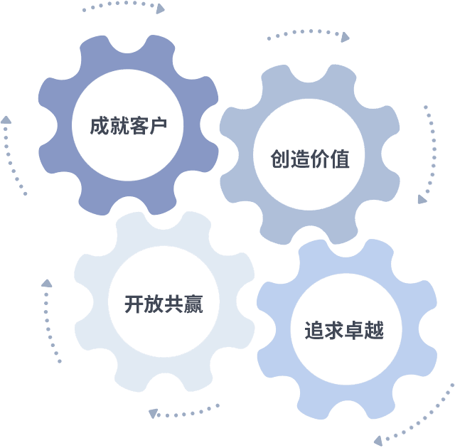 成就客户是一切决策的出发点,,,,创造价值是衡量所有工作的标准,,,,追求卓越是我们做事做人的态度,,开放共赢是我们的格局也是最终的结果。。价值观的齿轮环环相扣,,,,推动着组织里的每个人不断向前。。