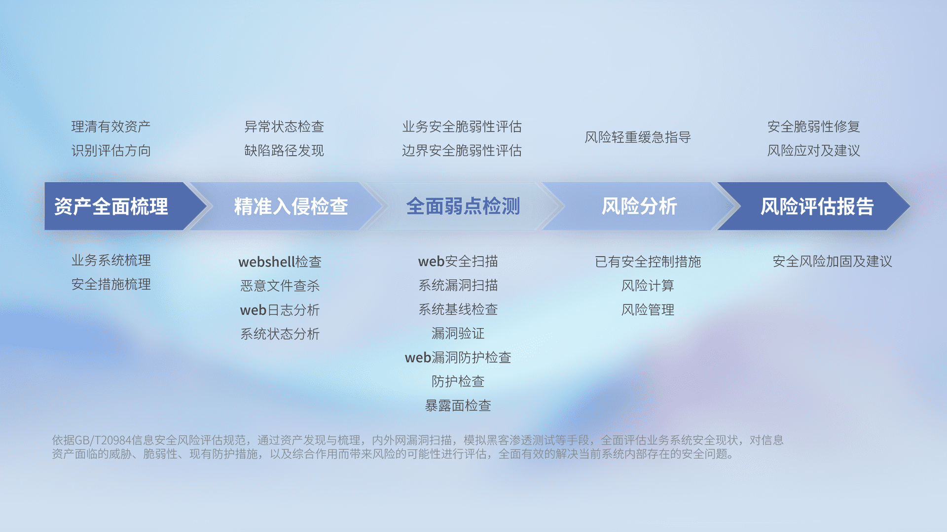 针对客户行业特性,,,,以专业的安全服务+多厂商联合解决方案提供专属的一站式安全管理服务,,帮助客户全面感知网络空间威胁,,,基于识别、、检测、、分析、、防护、、监测、、响应的服务理论模型,,,,从方案咨询、、、、集成交付、、评估验证、、、、优化加固、、运维运营,,致力于为客户提供完整的闭环管理式安全服务。。。以实战经验为客户打造高抵御风险的安全体系,,,,帮助客户发现威胁、、对抗威胁、、、处置威胁,,,,不断积累安全对抗能力,,持续保障数字化安全。。